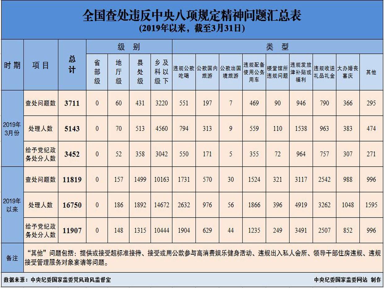 为掌握全国贯彻落实中央八项规定精神情况,中央纪委在各省区市和新疆生产建设兵团、各中央和国家机关、各中央企业和中央金融企业等建立了落实中央八项规定精神情况月报制度。2019年以来,截至3月31日,全国查处违反中央八项规定精神问题情况如下: